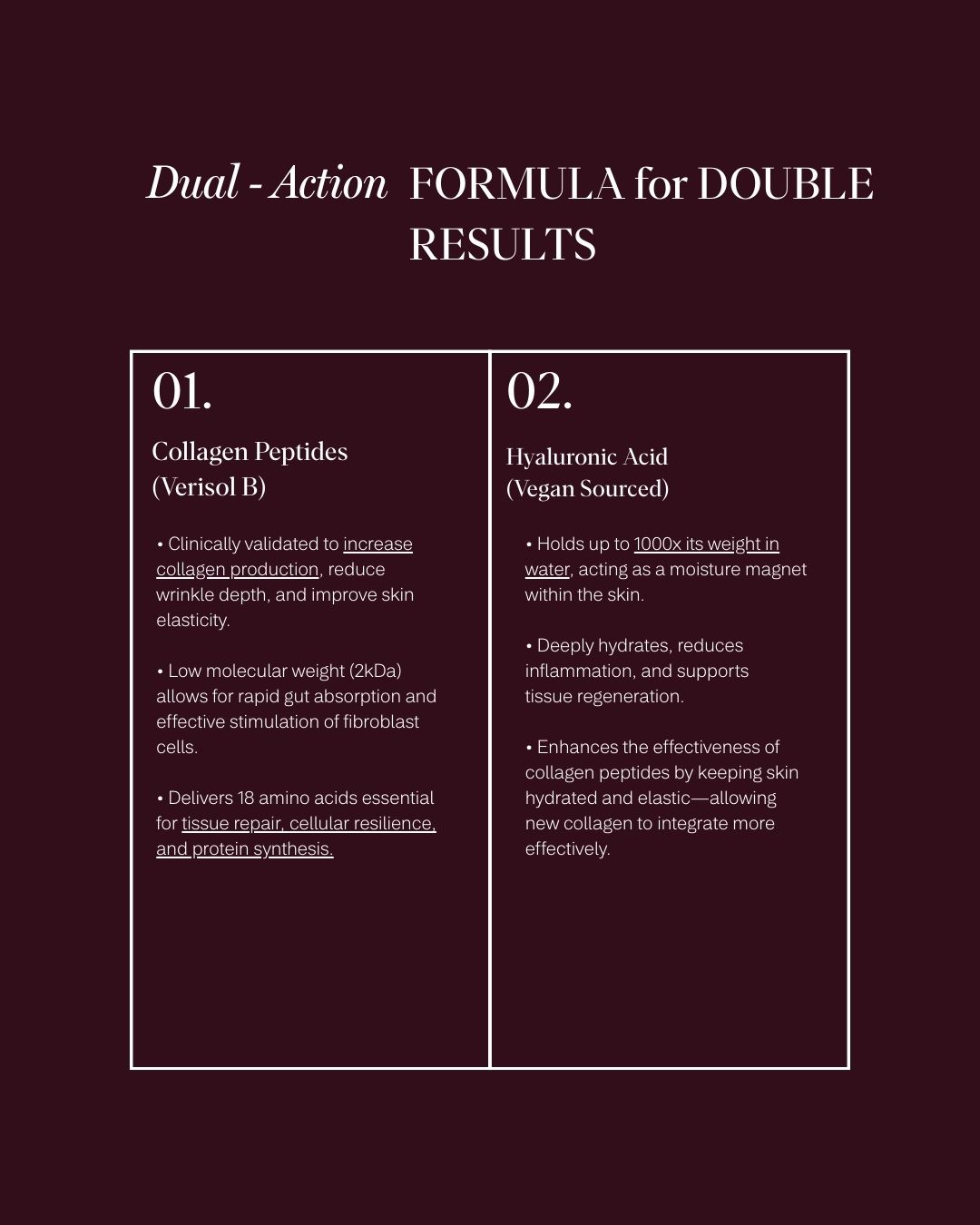 Powered by low molecular weight Bioactive Collagen Peptides (2kDa) and Hyaluronic Acid, capable of binding 1,000x its weight in water, this double-impact formula visibly plumps, hydrates, and restores skin, hair and joint health from within. This is your skin’s moisture magnet.