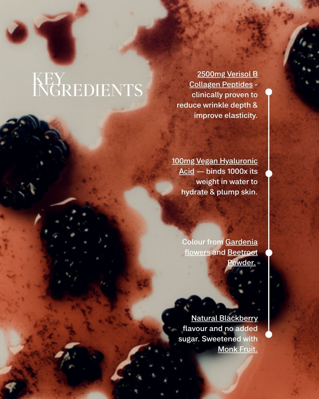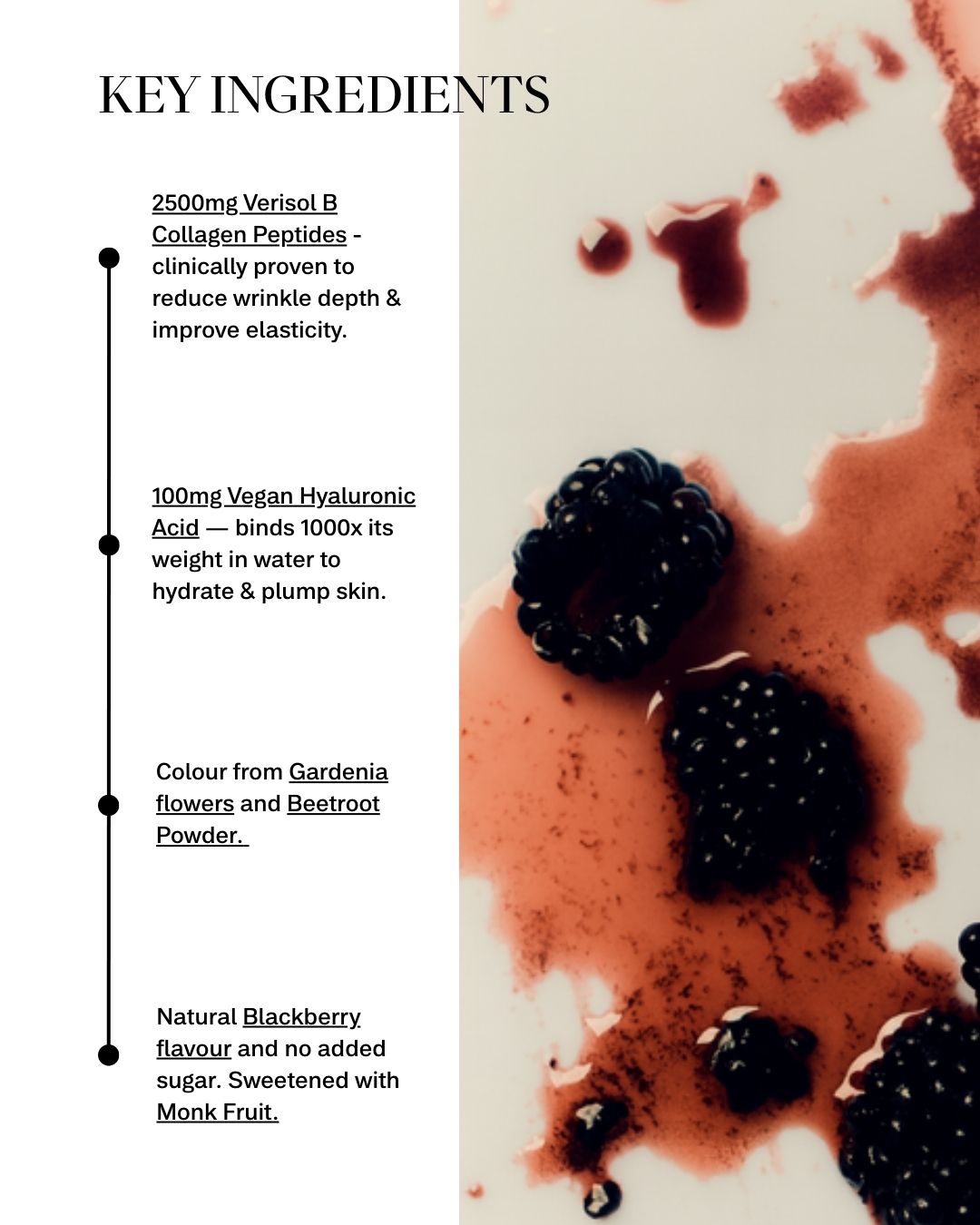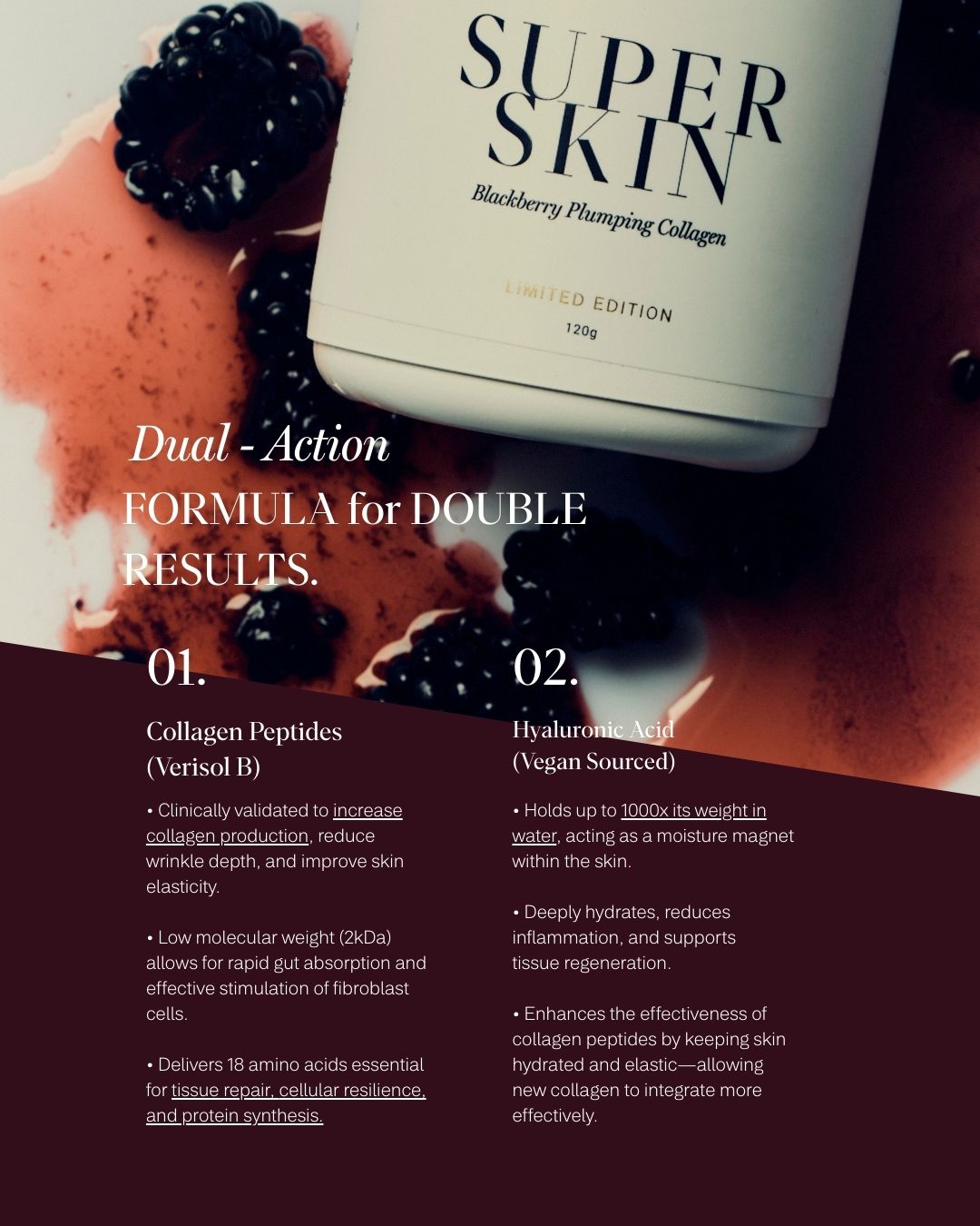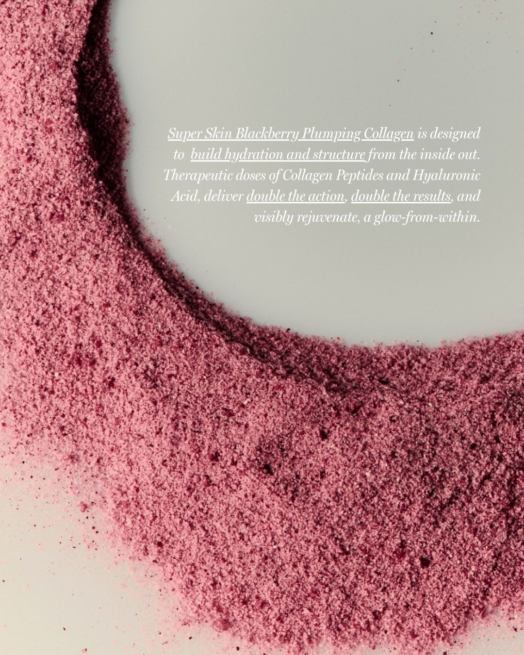 Super Skin Blackberry Plumping Collagen is your daily, delicious, juicy blackberry burst Collagen Peptide formula infused with Hyaluronic Acid to mobilise deep cellular hydration, boost skin elasticity, stimulate collagen cross-linking, and address visible skin laxity.